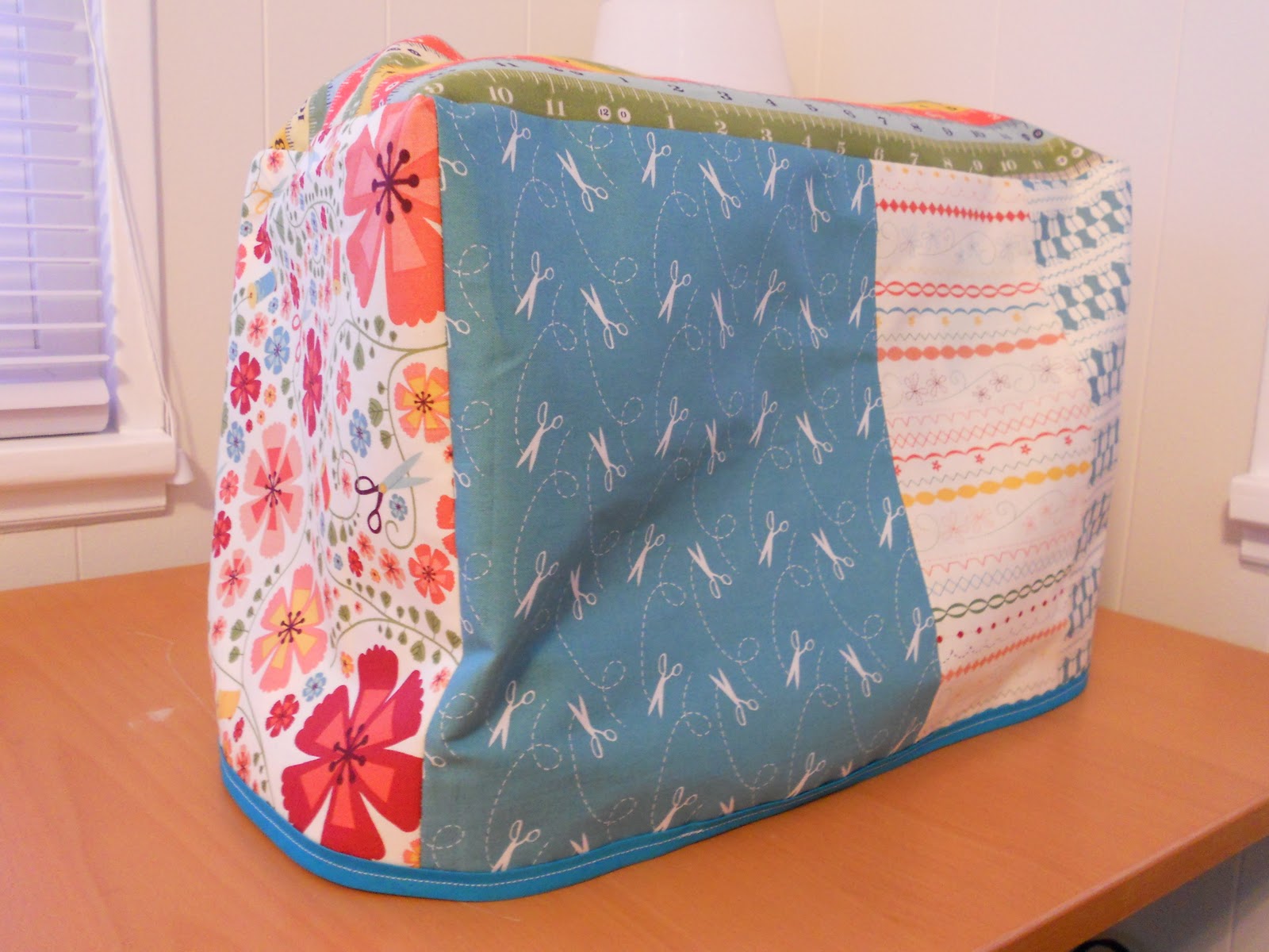 I actually made most of the sewing machine cozy a few weeks ago but hadn't gotten around to adding the bias trim until this weekend. I should have taken a picture because it looked really sad — too much material at the bottom and really floppy.I used a pattern from one of my books, Sew Everything Workshop by Diana Rupp, and adjusted the measurements to fit my machine. The pattern in the book uses oilcloth, but I wanted something softer. A lot of the tutorials I found online also added stiff interfacing to give it real structure, but I liked the looser look better, so I went without. The bias tape provides sufficient weight to help it stand up off the table. I didn't bother to line it because you won't see the inside anyway.
